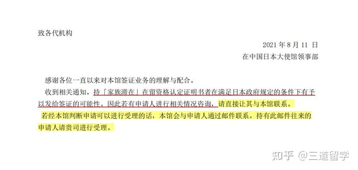 从文件中看出,受理家族滞在的前提是,需要申请人跟领事馆直接联系,如果符合日本政府规定的条件,经领事馆判定可以受理的话,领事馆会与申请人通过邮件联系,持此邮件往来的申请人可以找代办机构办理家族滞在。